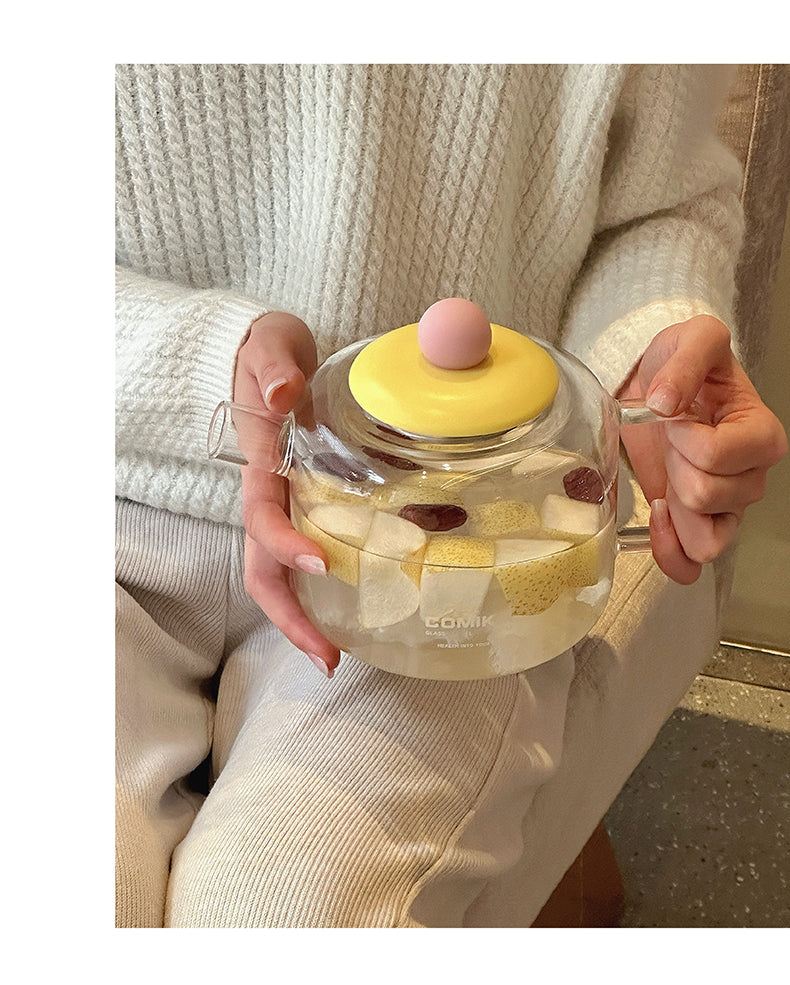 Features a cute yellow lid with a pink spherical knob, adding a sweet, stylish touch to your kitchen/tea station. The transparent glass body lets you enjoy the visual delight of tea leaves steeping or blooming. -