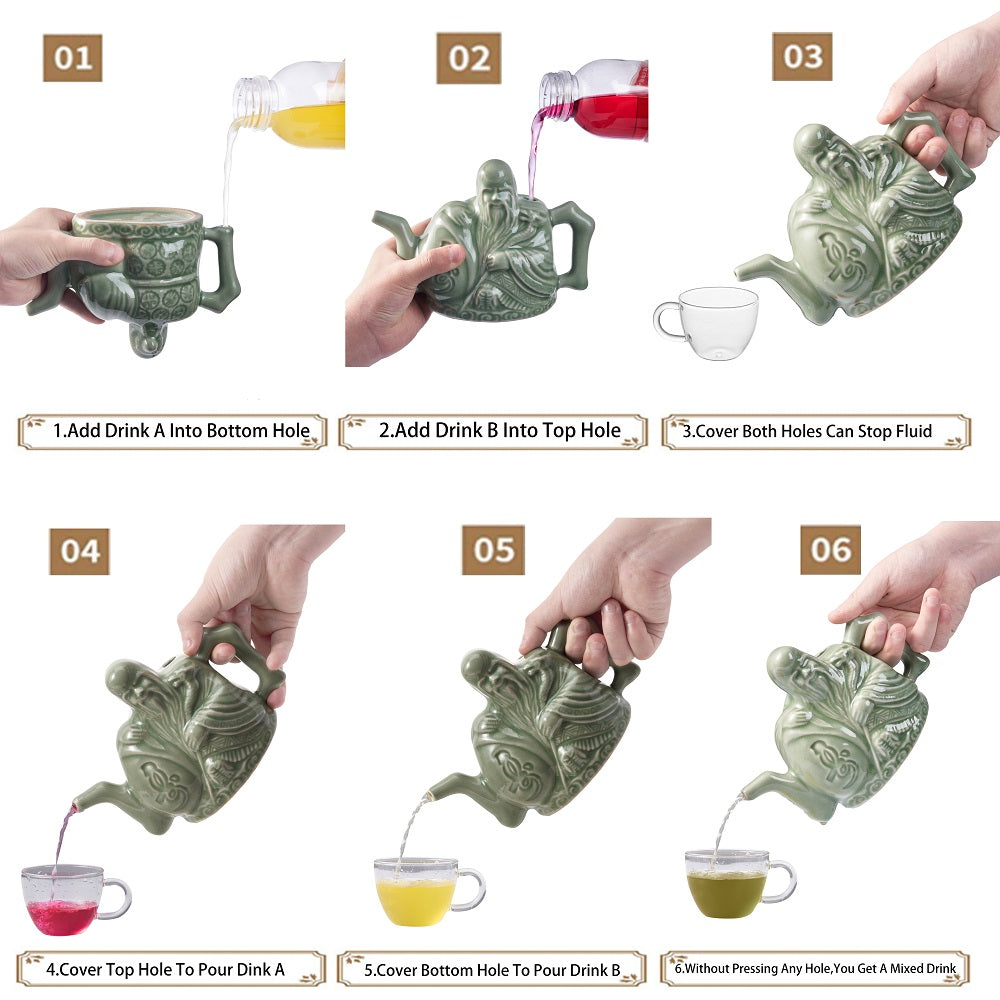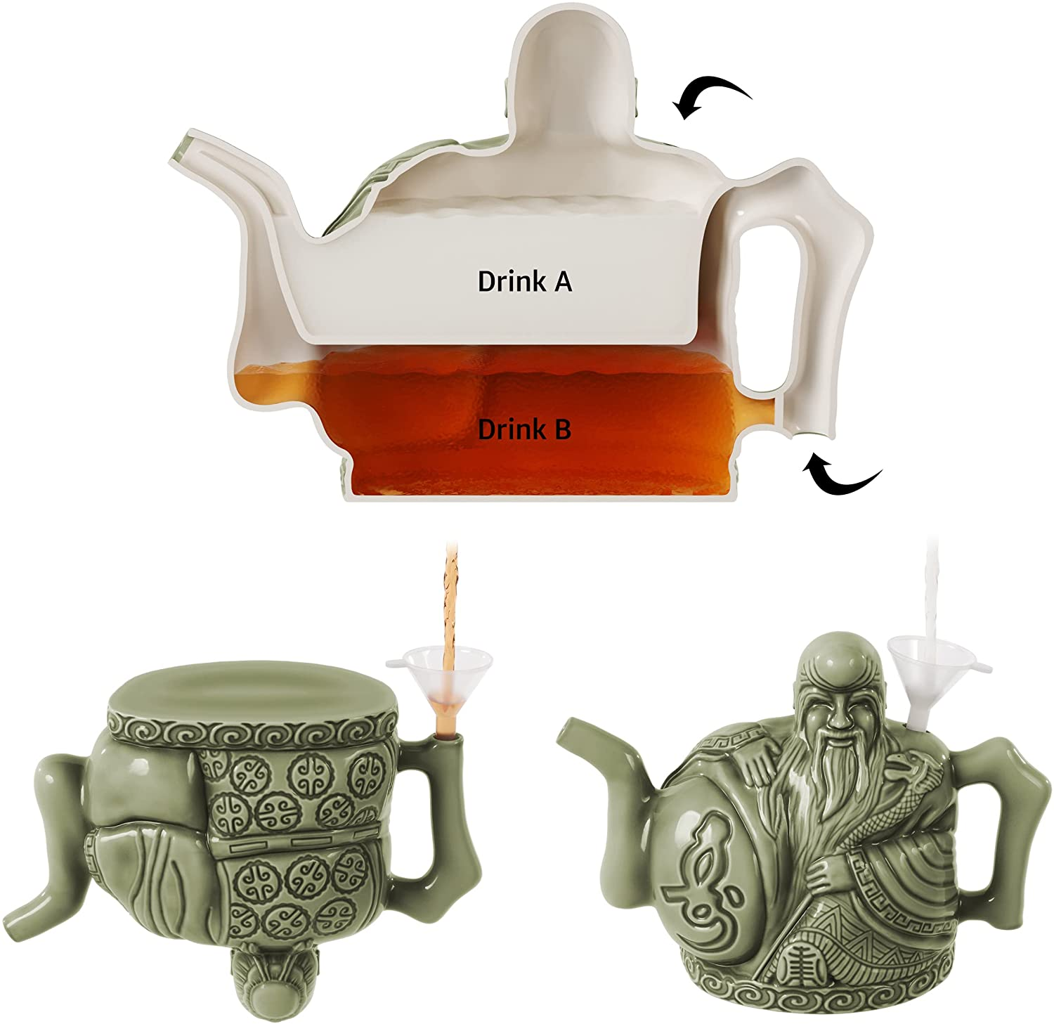 - ✅ How It Works: There Is Two Compartments Inside Of This Teapot Each One Can Hold A Different Liquid. With Your Finger You Can Block One Or Even Both Of The Holes Used To Fill This Teapot Up And Then You Can Decide Which Liquid Should Come Out Of The Pot.
