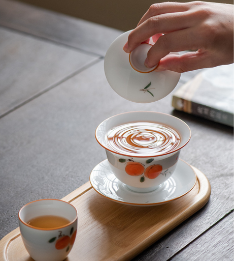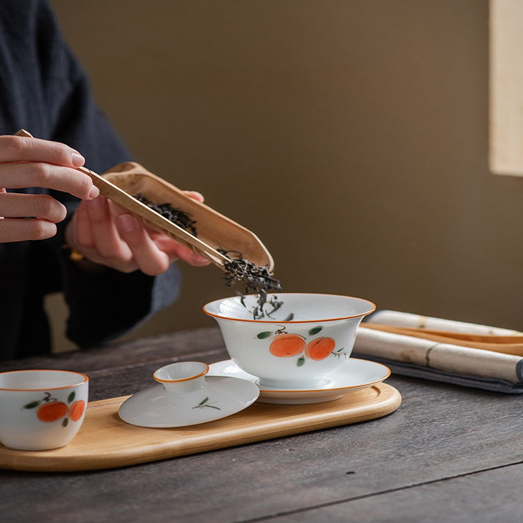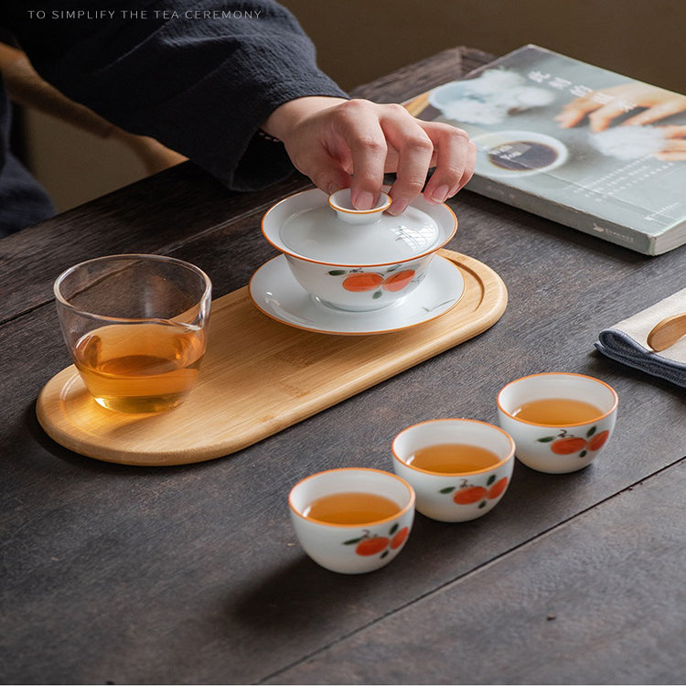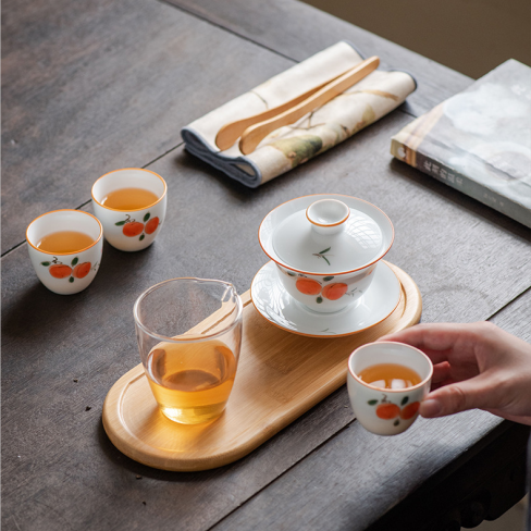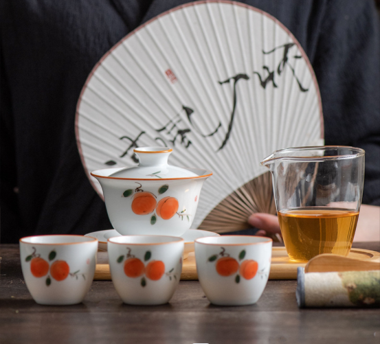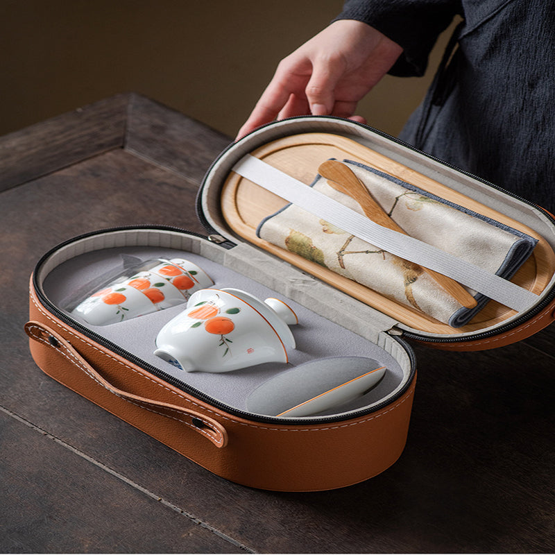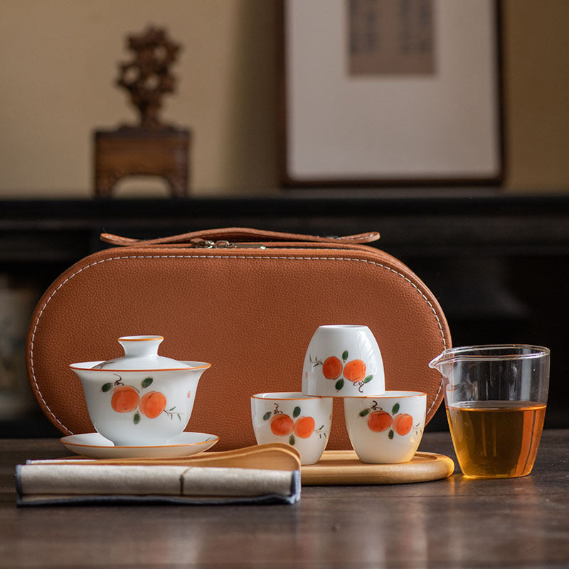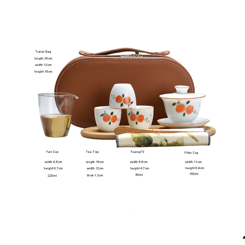 The handpainted portable tea set is a good choice for your travel, gift and tea lovers. The persimmon on the tea set is handpainted,  and the craftsman paints on the porcelain. Persimmon, in Chinese, means auspiciousness, success, and Lucky.