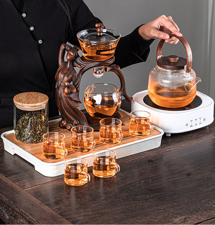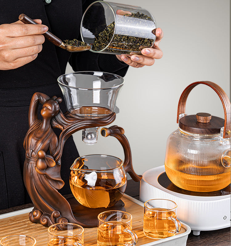 Chang'e is the Chinese goddess of the moon who consumed an elixir of life before flying to the moon. This lazy magnetic kung fu teapot set is designed with Chang'e flying to the moon. It has a unique shape and a good fusion of Chinese style. This tea set is made of resin and high-strength silicon glass, which is healthy and environmentally friendly. It is the best choice for tea lovers, and it is also an exquisite gift for friends.